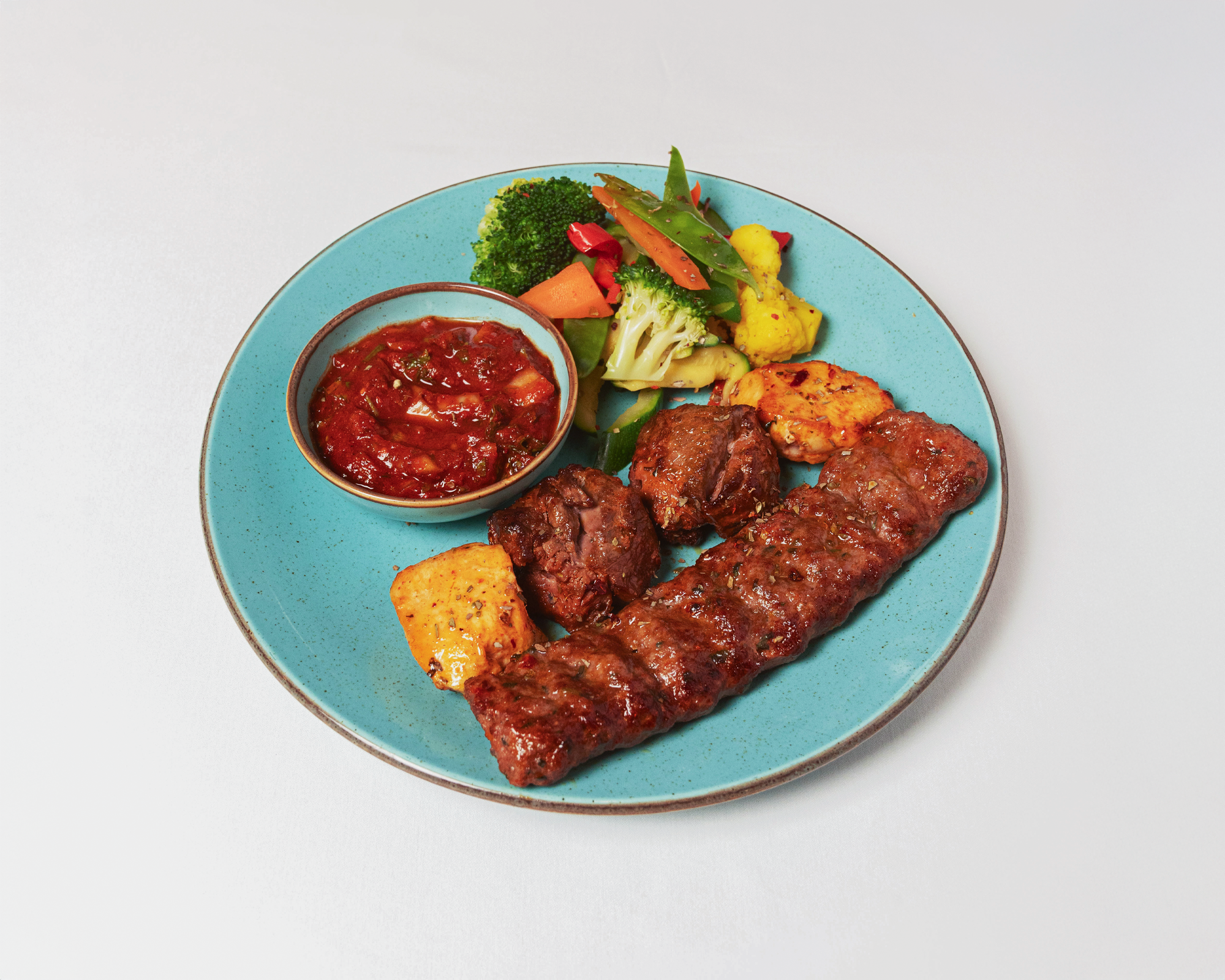Marinated chicken and lamb cubes with kofte, served with seasonal vegetables and homemade chilli sauce