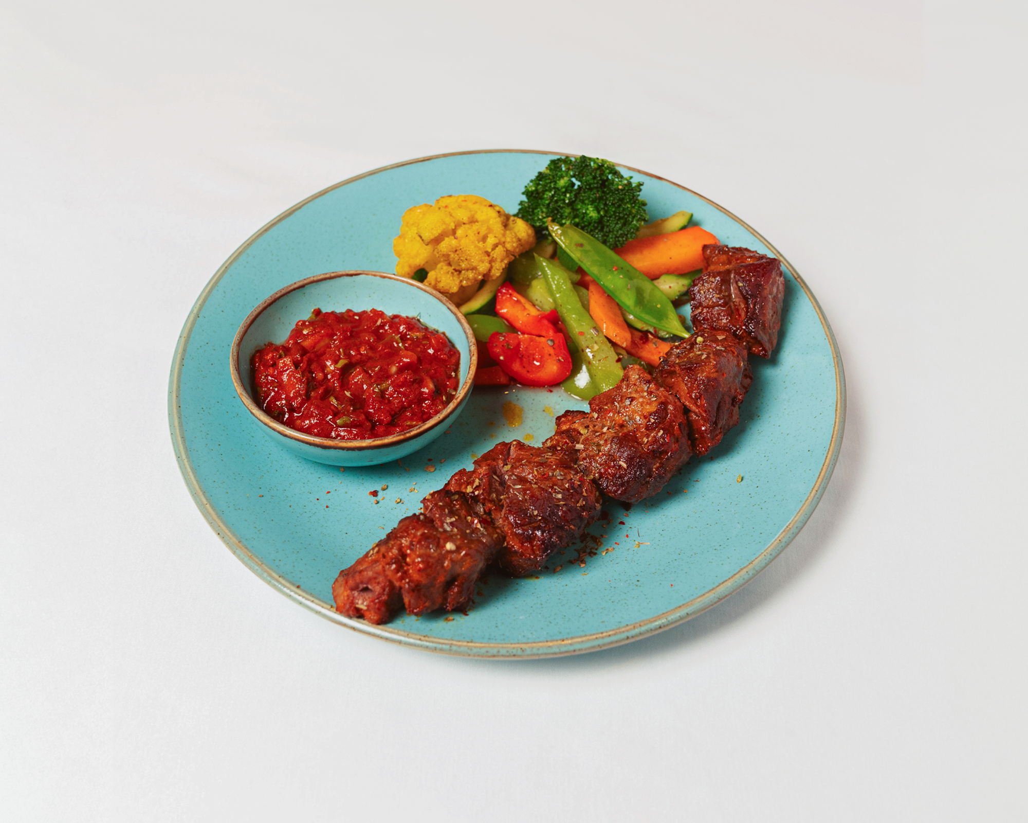 Skewer of marinated tender lamb cubes, served with seasonal vegetables and homemade chilli sauce